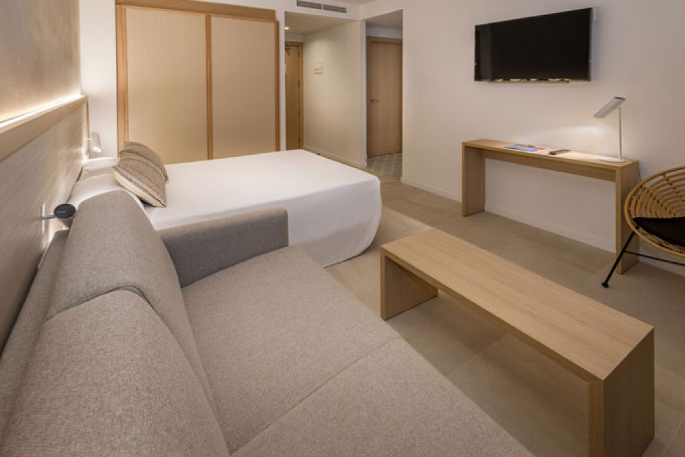 Dieses Zimmer ist vorzüglich für Familien mit kleinen Kindern, da es zwei Doppelbetten oder 1 Doppelbett und 2 Einzelbetten verfügbar sind. Hier könnte auch nicht fehlen unser avantgardistischer und mediterranischer Stil, der uns auszeichnet. Ein geräumiges und komfortables Zimmer für die ganze Familie. Alles, was Sie brauchen, um Ihren Familienurlaub zu geniessen!
